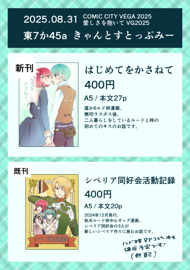 8月31日に東京ビックサイトで開かれるCOMIC CITY VEGA 2025内の、愛しさを抱いて VG2025にサークル参加します。